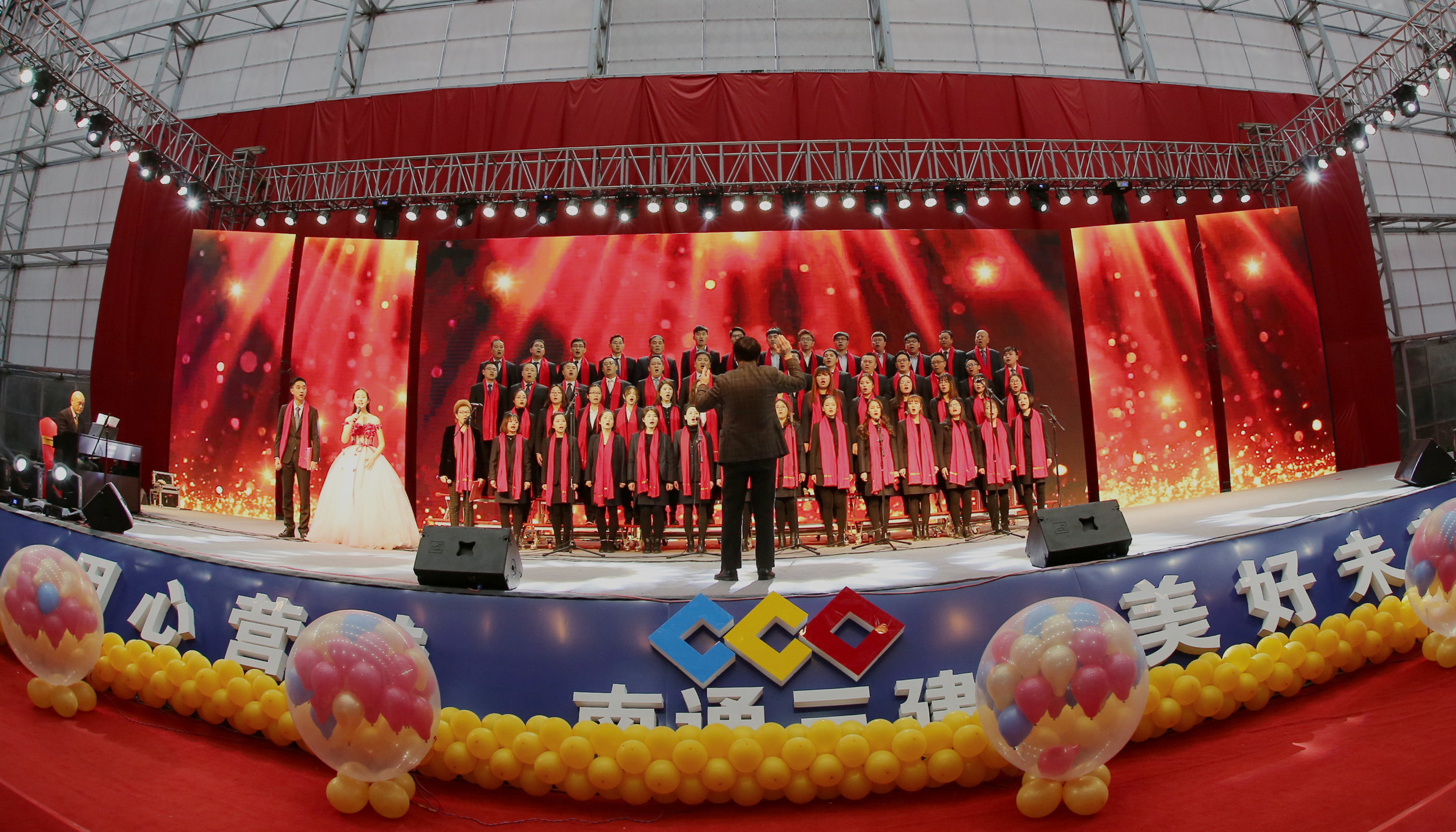 中国南通三建、总承包事业部员工表演大合唱《不忘初心》、《祖国你好》。