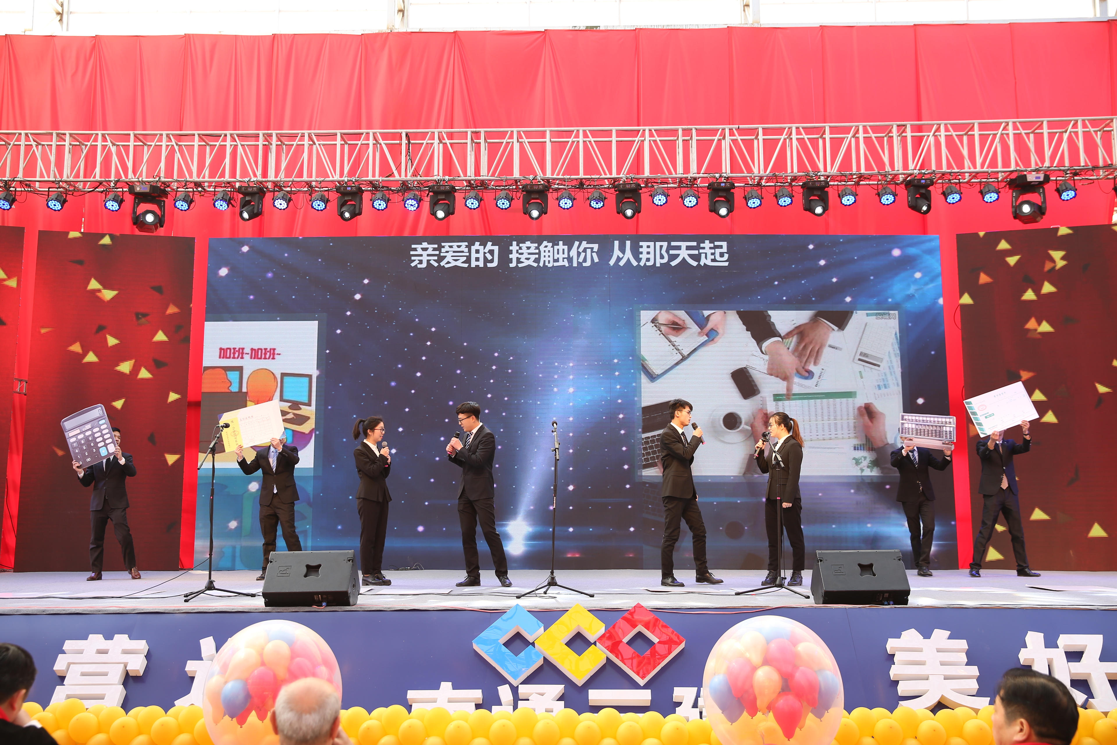 青岛涌泰员工表演歌舞情景剧《出彩三建》。
