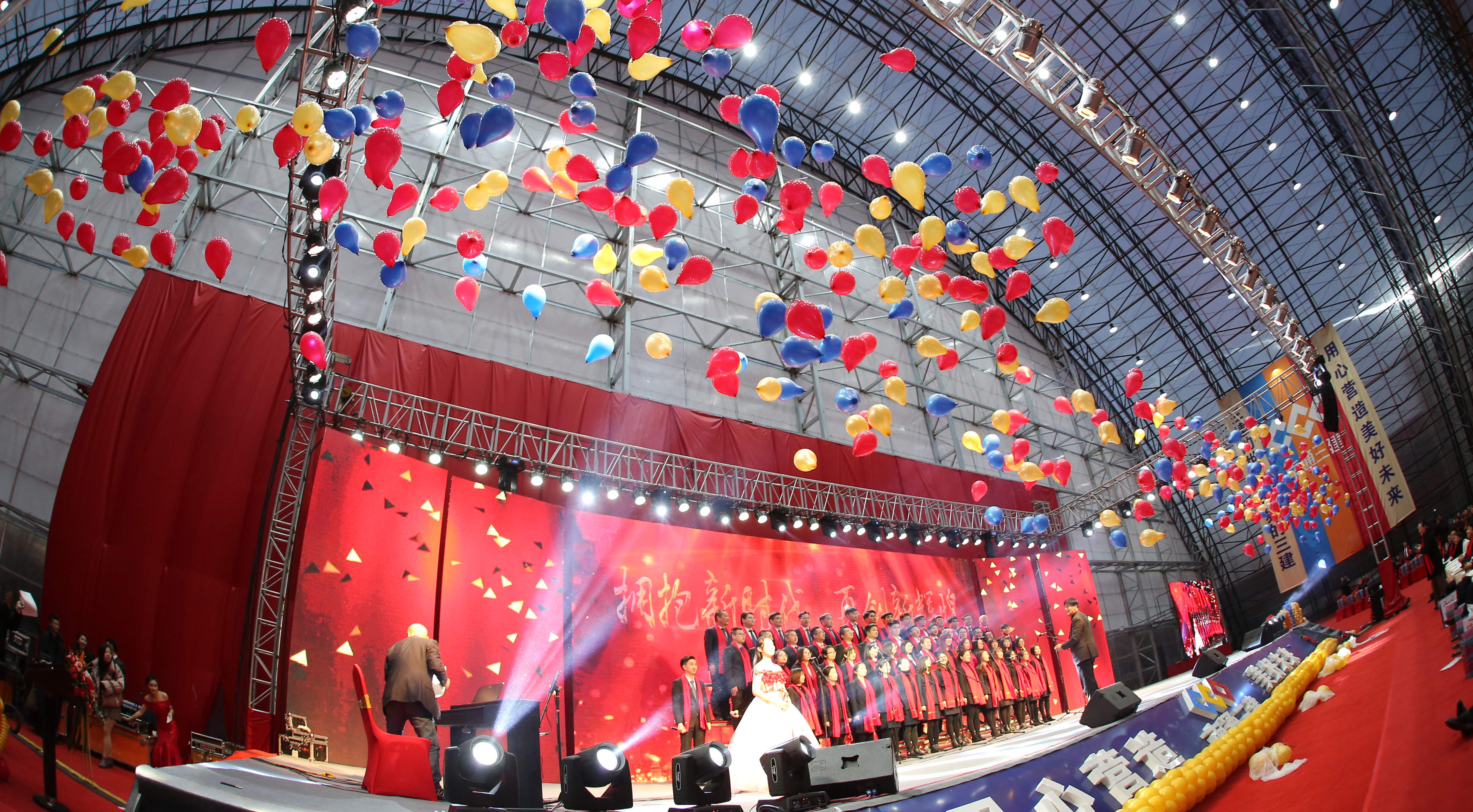 盛典现场,灯光璀璨,花团锦簇,喜气祥和。