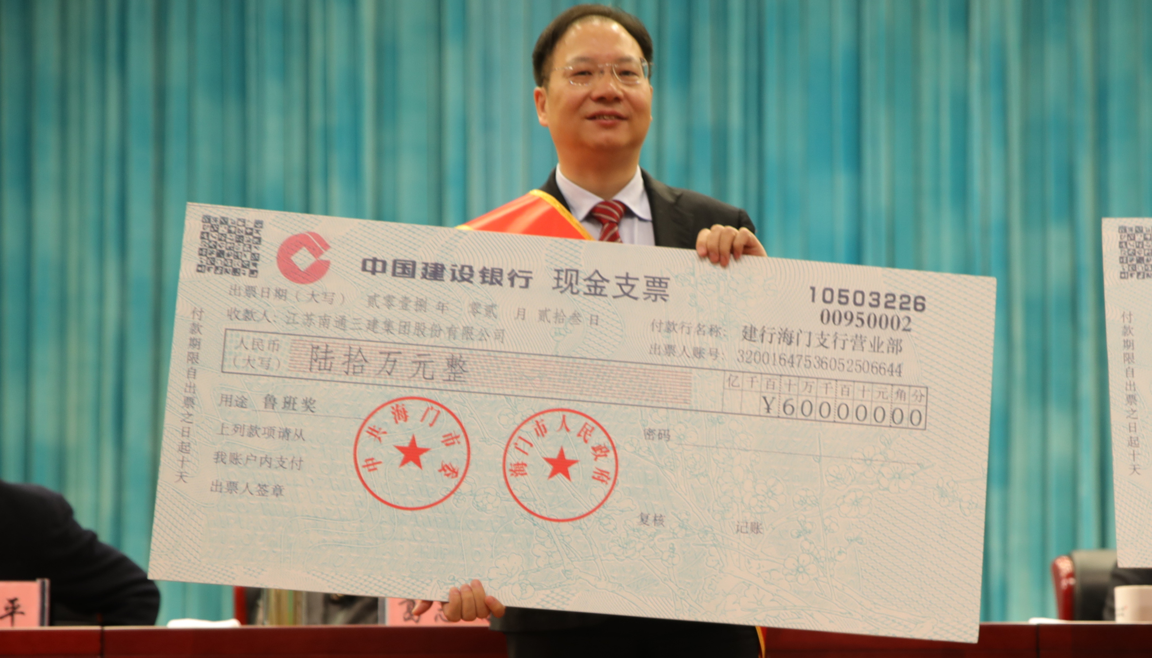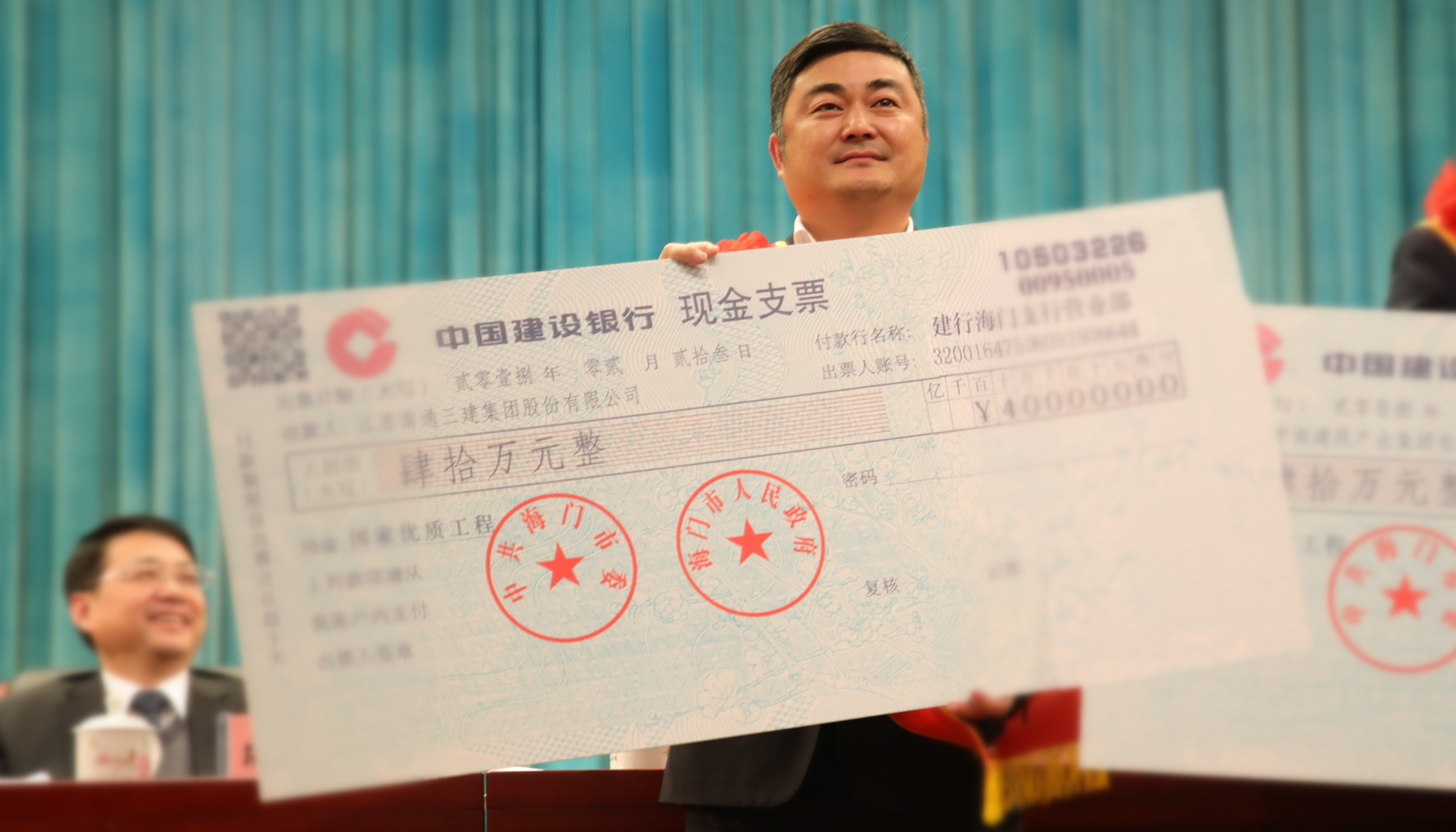 南通三建控股集团董事局副主席、股份公司总裁施晖领取集团创国优奖奖励。