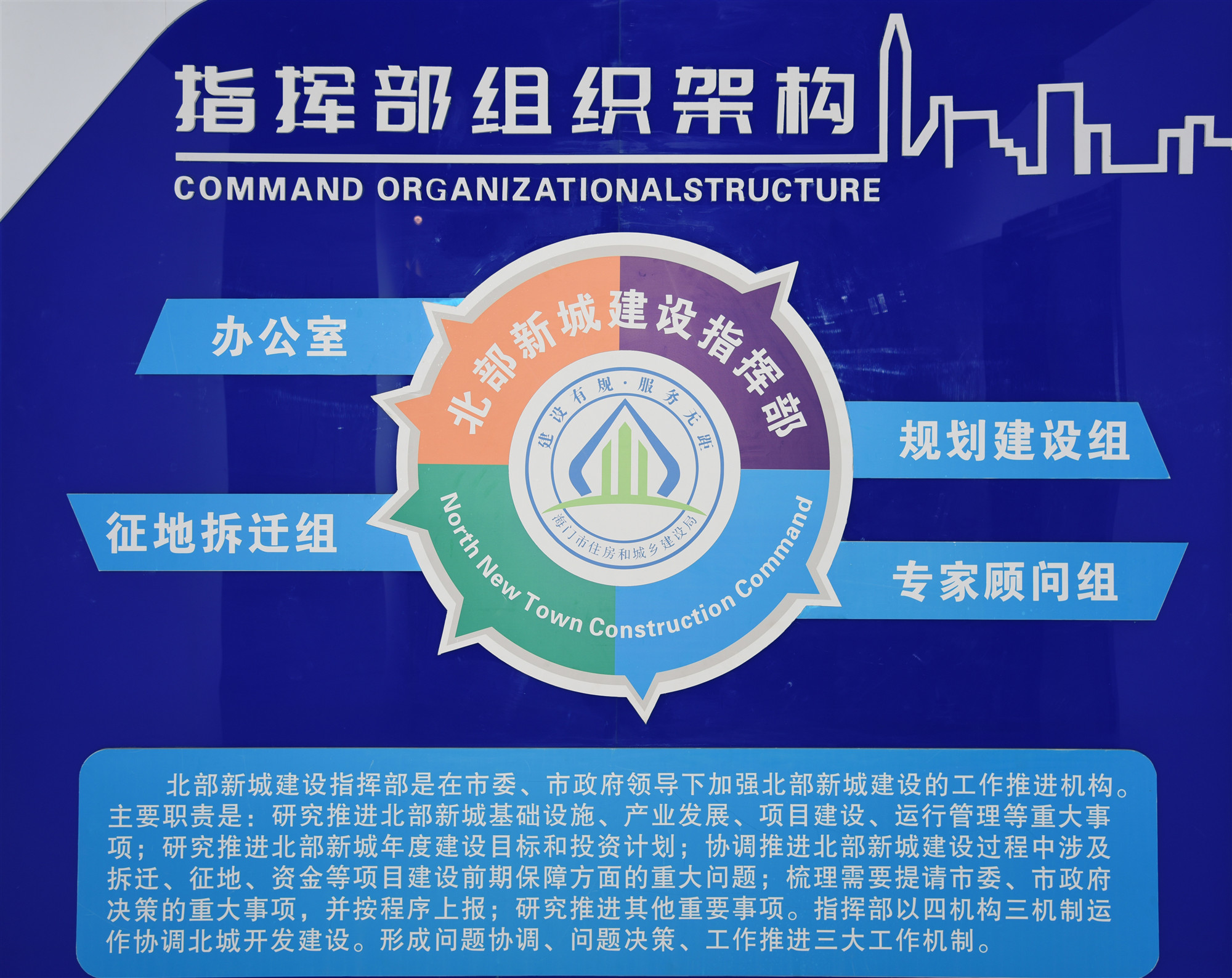 为切实加强对北部新城建设的组织领导,2019年5月16日,海门区委、区政府成立北部新城建设指挥部,由区政府副区长周国强担任总指挥,下设办公室、规划建设组、征地拆迁组、专家顾问组。北部新城建设指挥部主要职责是:研究推进北部新城基础设施、产业发展、项目建设、运行管理等重大事项;研究推进北部新城年度建设目标和投资计划;协调推进北部新城建设过程中涉及拆迁、征地、资金等项目建设前期保障方面的重大问题;梳理需要提请市委、市政府决策的重大事项,并按程序上报;研究推进其他重要事项。