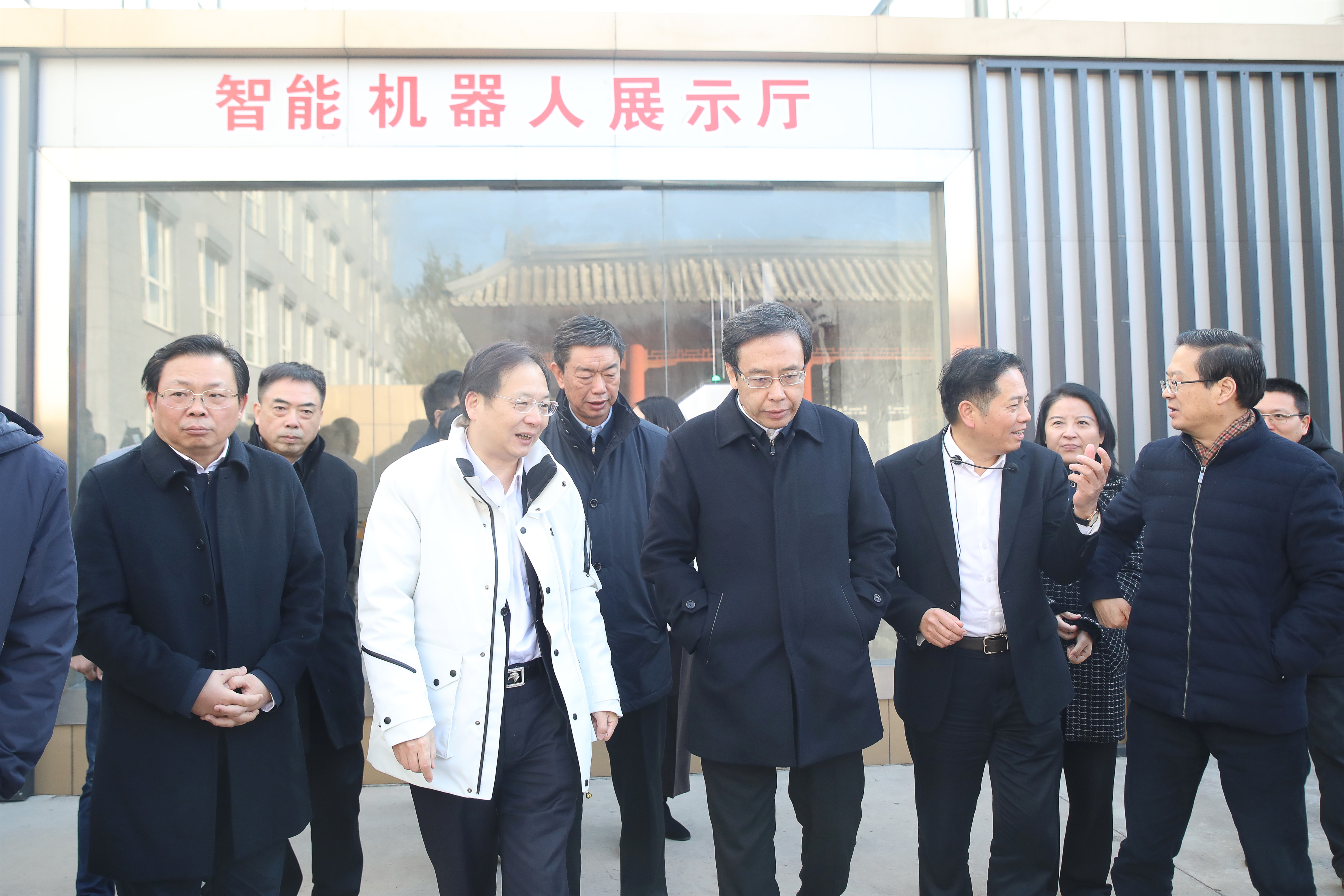 王晖市长一行在黄裕辉董事长和周炳高总裁的陪同下,首先在智能建筑机器人施工现场展示厅驻足,面前展示的是智能建筑机器人系列——抹灰机器人现场施工的应用场景。当听到周炳高总裁介绍“智能建筑机器人由企业自主研发、生产,在同等施工条件下1台机器人完成5名施工工人的粉刷工作量,在2021年1月中旬将推出五款智能建筑机器人”时,王晖市长详细了解了智能建筑机器人的研发成本、运行效率、施工质量和操作方式,并指出,机器代人是建筑行业工业化、数字化、智能化发展的重要体现,要在施工现场进行反复的实用性研究,企业要把好风向标,走上快车道。