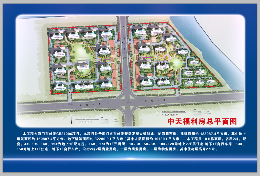 该项目位于海门东灶港新区发展大道路北、沪海路东西两侧,建筑面积309373平方米,工程造价约11亿;其中地上建筑面积250337平方米,地下建筑面积59036平方米;共28栋单体,其中高层16栋、多层6栋、单体叠墅6栋;总工期570天,将于2022年12月31日前精装交付完毕。
