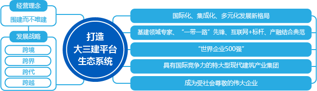 围绕“围建而不唯建”经营理念,实施“跨境、跨界、跨代、跨越”发展战略,构建大三建平台商业生态系统,打造国际化、集成化、多元化发展新格局,成为“基建领域专家、‘一带一路’先锋、互联网+标杆、产融结合典范”,实现高质量发展,进入“世界企业500强”,成为具有国际竞争力的特大型现代建筑产业集团,成为受社会尊敬的伟大企业。