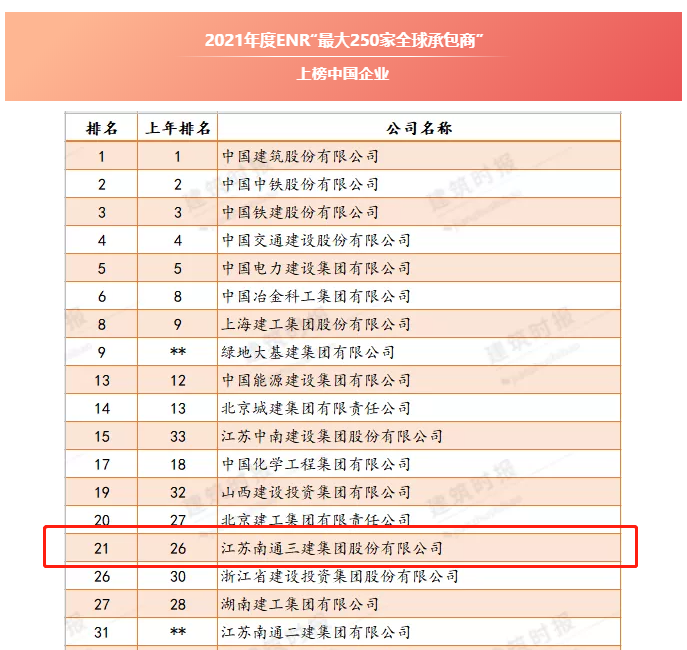 ENR“最大250家全球承包商”榜单发布 南通三建位居全球第21位