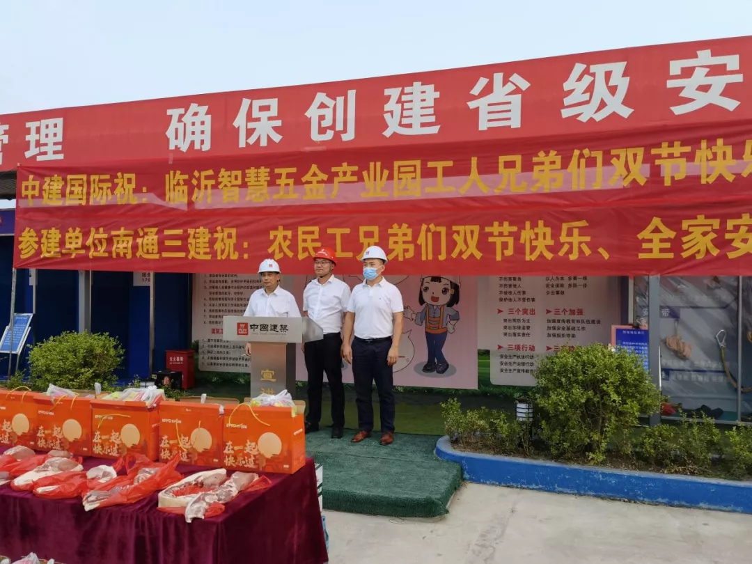9月18日,南通三建第186工程处临沂智慧五金产业园项目组织开展“迎中秋、庆国庆”双节慰问活动。中建国际临沂公司总经理肖佳豪、临沂市东城建设投资集团副总经理孟现雄共同参加了慰问活动。