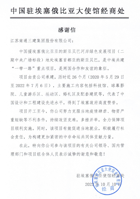 该项目自2020年5月29日开工以来,南通三建管理团队在挑战面前保持定力,以高度的责任感和凝聚力带领项目走出了新冠疫情、埃塞内乱等不可抗力的泥潭,高质量兑现了履约承诺,项目获得埃塞各方的高度评价,现已经成为该国接待重要外宾的打卡地。中国驻埃塞俄比亚大使馆经商处也向南通三建发来了感谢信,高度肯定了工程质量,感谢公司的付出。